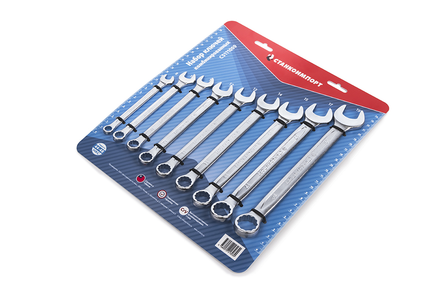 Набор комбинированных ключей Станкоимпорт содержит в себе 9 предметов, представляющих собой конструкцию, объединяющую рожковый и накидной профили. Данный набор состоит из следующих размеров: 8 мм, 10 мм, 11 мм, 12 мм, 13 мм, 14 мм, 15 мм, 17 мм, 19 мм. Поставляется на подложке из пластика, на которой ключи крепко зафиксированы с помощью хомутов. Подложка имеет линейку, что предоставляет возможность ее дальнейшего использования.